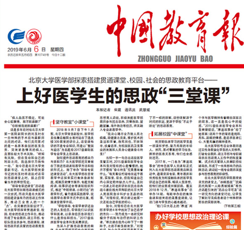 2019年6月6日,《中国教育报》头版头条报道北大医学立德树人成果