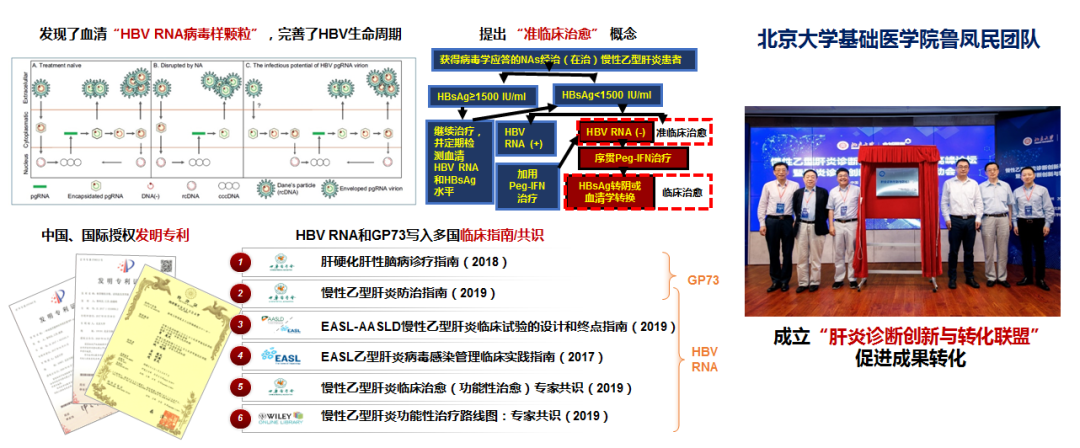 在国家“传染病防治”科技重大专项的连续支持下,鲁凤民教授团队系统证实血清HBV pgRNA的来源、存在形式及临床意义,获得了国际首个HBV pgRNA核心专利并建立了标准的检测体系,作为新指标写入中国、美国和欧洲临床指南/共识。HBV pgRNA和GP73等相关研究成果入选2019年全国科技活动周 “国家科技重大专项”科技成果展、 “首都优秀科技创新成果”,在国家传染病综合防治示范区推广应用。获国家发明专利授权10项,国际专利授权1项,成功实现转化9项。