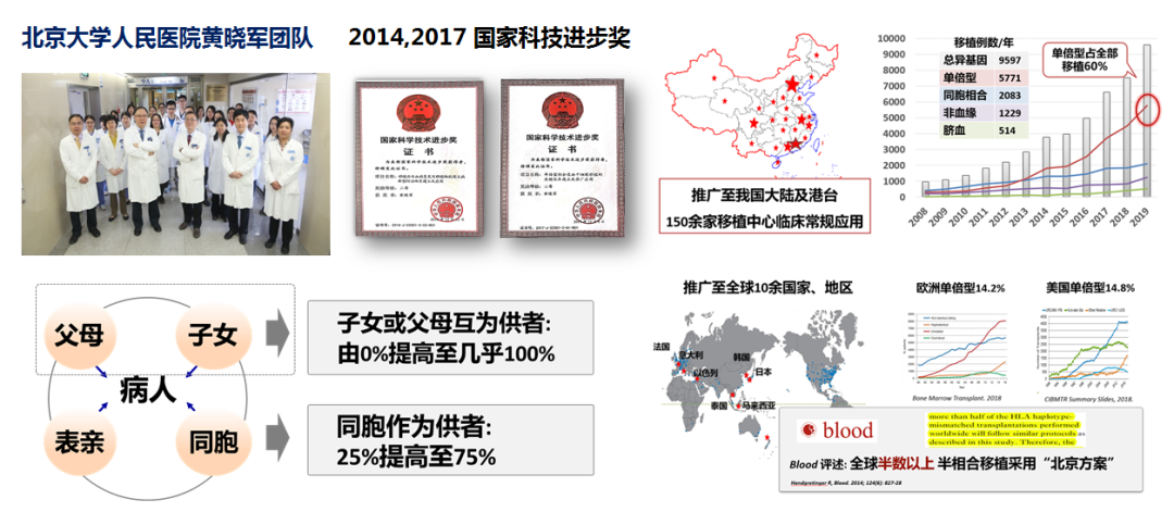 异基因造血干细胞移植是治愈恶性白血病最有效的方法,突破人类白细胞分化抗原(HLA)限制、解决供者来源匮乏等公认世界难题。北京大学人民医院黄晓军团队突破细胞因子诱导免疫耐受、改善造血微环境促进造血干细胞植入等关键技术,首创国际公认非体外去T单倍型相合造血干细胞移植体系,使得“父母供子女”等移植模式取得与HLA相合移植疗效一致。被世界骨髓移植协会命名为“北京方案”(Beijing Protocol),推广后覆盖全球单倍型移植病例50%以上,单倍型供者成为我国排名首位造血干细胞来源。“北京方案”核心技术两次获得国家科技进步二等奖。
