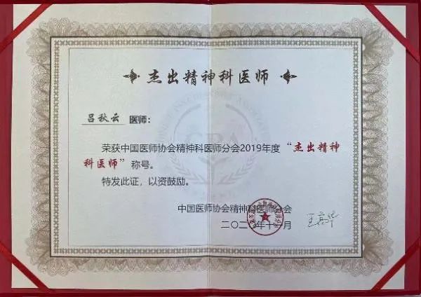 吕秋云教授荣获中国医师协会精神科医师分会“2019年度杰出精神科医师”荣誉称号
