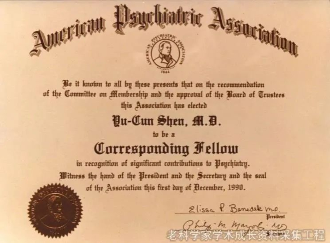1990年,沈渔邨选为美国精神病学国外通讯院士证书