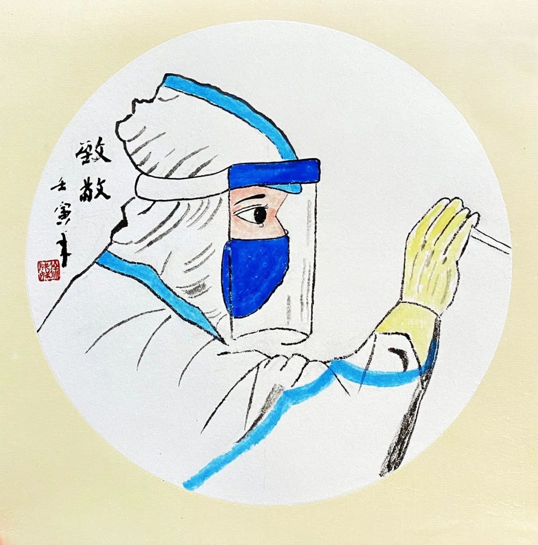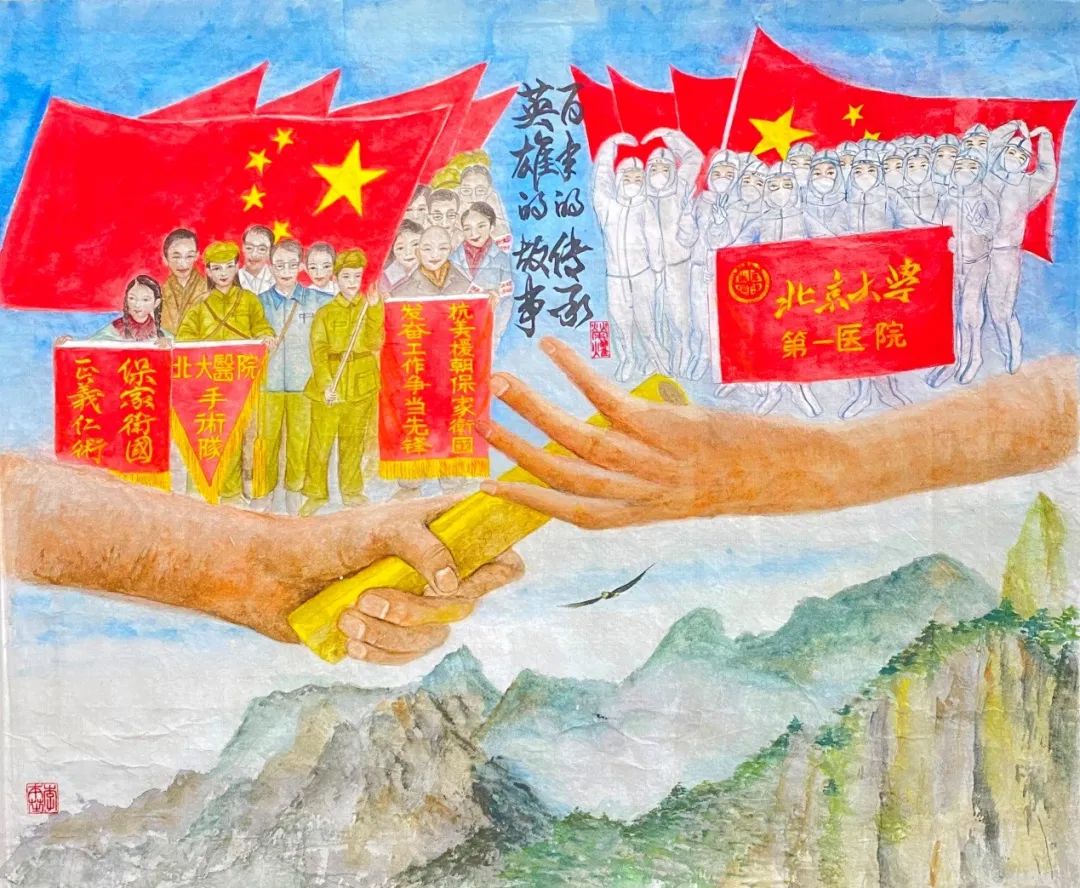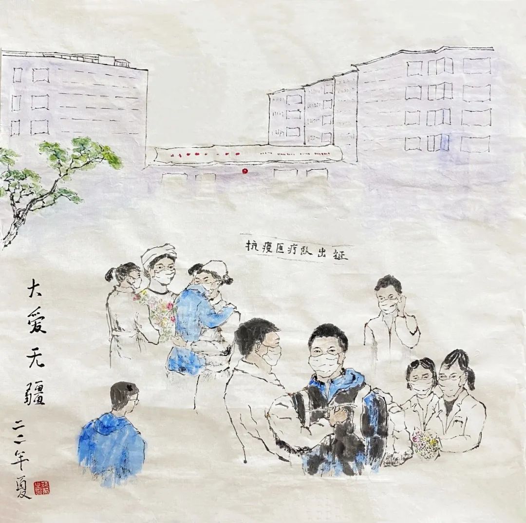 每当发生重大疫情、灾情威胁到人民健康时,都有北大医院人的身影。每当我们奔赴前线,医院领导和同事们都会在第二住院部东广场为我们送行,依依惜别。所以,以此为主题创作。我翻阅诸多素材,在构图、用笔、着色等方面获得了许多灵感,最终完成此画。
