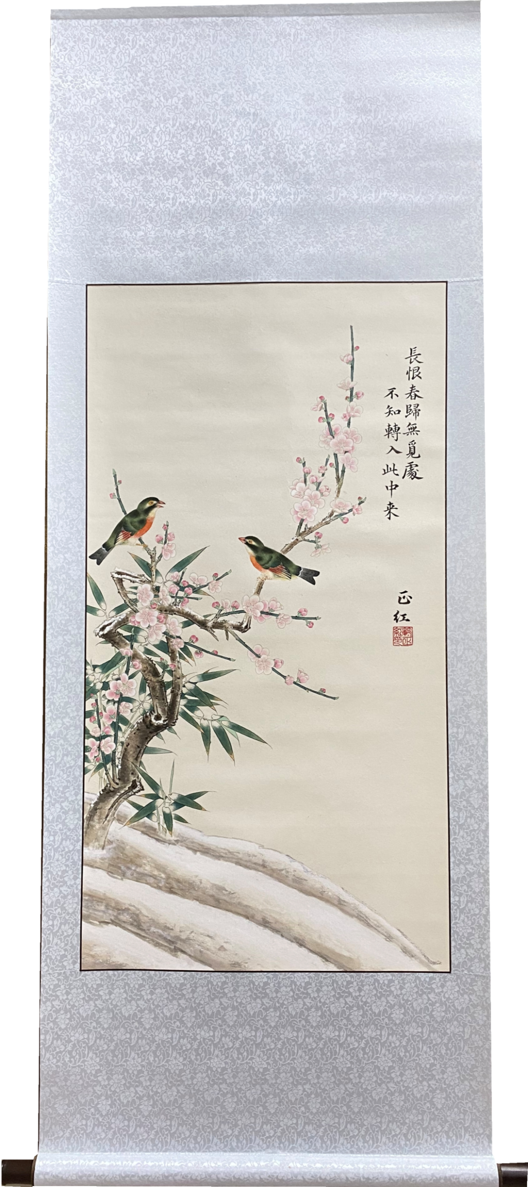 这幅《早春》图以传统的工笔重彩手法表现了初春杏梅花在雪中绽放,树干和绿竹上落满积雪。一对美丽的相思雀在枝头鸣唱,好似祈盼春天的到来和人间的一切美好如愿。