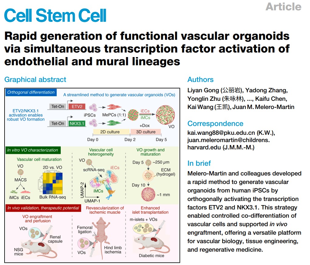 2025年6月13日,来自北京大学基础医学院/血管稳态与重构全国重点实验室/细胞稳态与衰老性重大疾病北京研究中心的王凯课题组联合美国哈佛医学院/波士顿儿童医院的Juan Melero-Martin团队合作在Cell Stem Cell发表题为Rapid generation of functional vascular organoids via simultaneous transcription factor activation of endothelial and mural lineages的文章,报道了正交激活血管细胞命运决定转录因子ETV2和NKX3.1快速生成VOs的新方法。该方法能在5天内大量生成尺度大小均一的VOs,具有基底-顶层极化的管腔化血管结构以及成熟多样的内皮细胞和平滑肌细胞群体。体内实验表明,正向编程生成的VOs在局部注射后具有治疗缺血疾病(eg.下肢缺血)的潜力。如果实行VOs联合胰岛的共移植,也能促进胰岛移植后的快速血管化和功能正常化,从而治疗糖尿病。总之,正向编程驱动干细胞快速生成血管类器官的新方法,摆脱了传统类器官制备所需的基质胶和生长因子,极大改善血管类器官的异质性,降低分化成本,为缺血疾病和糖尿病等疾病的细胞治疗提供了均一可靠稳定的功能性血管类器官(VOs)。