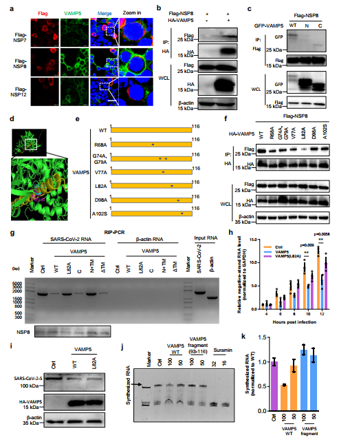 图2. VAMP5通过插入DMV与SARS-CoV-2的NSP8结合破坏病毒复制复合物而抑制病毒复制