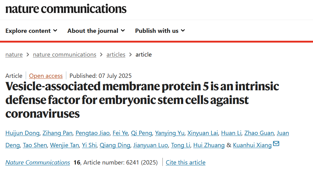 2025年7月7日,来自北京大学基础医学院病原生物学系与感染病研究中心的向宽辉课题组在Nature Communications发表题为Vesicle-associated membrane protein 5 is an intrinsic defense factor for embryonic stem cells against coronaviruses的文章,报道了胚胎干细胞内源性高表达囊泡相关膜蛋白5(Vesicle-associated membrane protein 5, VAMP5)广谱抑制病毒感染。该研究发现,VAMP5不仅在抑制SARS-CoV-2及其变异株、以及其他高致病性冠状病毒的复制方面表现出功能上的保守性,还可抑制其他病毒家族的复制能力。机制研究表明,VAMP5可定位于双膜囊泡(double membrane vesicles, DMVs),并通过其位于囊泡侧的C端结构域与病毒的非结构蛋白8(non-structural protein 8, NSP8)相互作用,从而抑制负链RNA的合成,阻断病毒复制。本研究表明,胚胎干细胞中的VAMP5通过干扰病毒基因组复制所依赖的DMVs保护环境,并与RNA复制复合物相互作用,以抵御病毒感染。这为开发广谱抗病毒治疗策略提供了新的思路。
