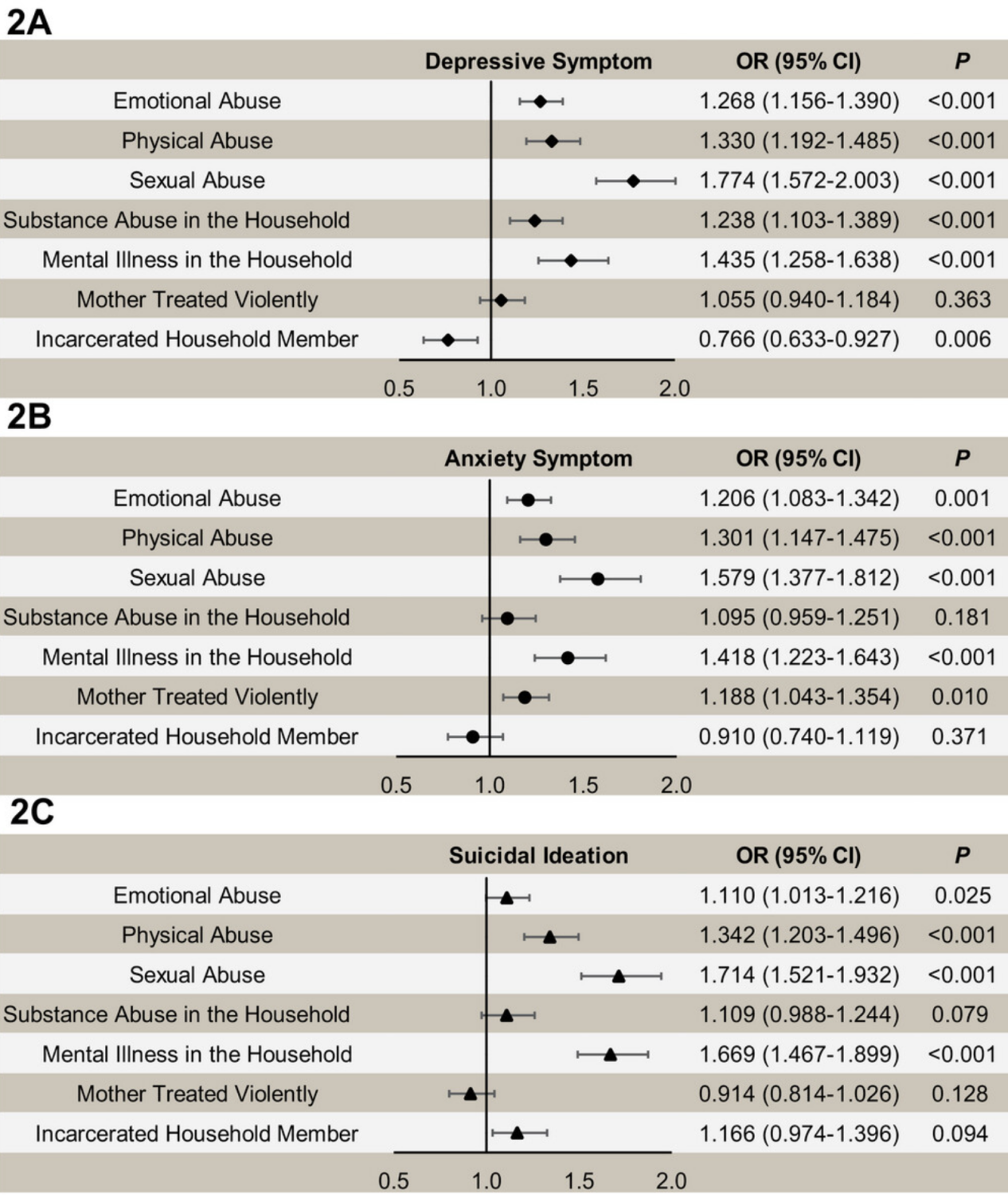 不同种类的ACE与抑郁症状、焦虑症状及自杀意念均存在显著关联(图2)。其中,与抑郁症状关联紧密的ACE包括性虐待(OR=1.774,95% CI:1.572-2.003)、家庭成员患精神疾病(OR=1.435,95% CI:1.258-1.638)及情感虐待(OR=1.268,95% CI:1.156-1.390);与焦虑症状关联紧密的ACE包括性虐待(OR=1.579,95% CI:1.377-1.812)、家庭成员患精神疾病(OR=1.418,95% CI:1.223-1.643)及躯体虐待(OR=1.301,95% CI:1.147-1.475);与自杀意念关联紧密的 ACE 包括性虐待(OR="1.714,95%" CI:1.521-1.932)、家庭成员患精神疾病(OR=1.669,95% CI:1.467-1.899)及躯体虐待(OR=1.342,95% CI:1.203-1.496)。回归分析显示,在所有单个ACE中,性虐待的OR值最高,其效应量显著超过多数其他预测因素(p<0.05)。