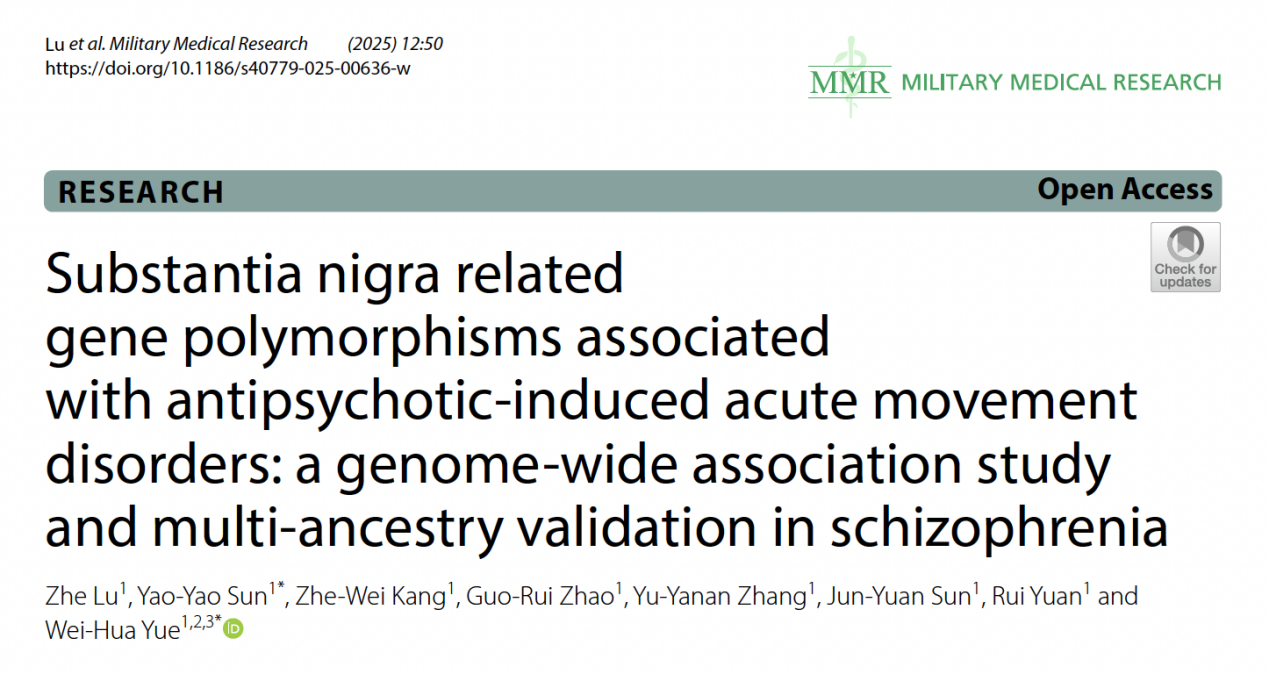 2025 年8 月19 日,北京大学第六医院(北大六院)岳伟华课题组在Military Medical Research (MMR, IF = 22.9) 在线发表了题为“Substantia nigra related gene polymorphisms associated with antipsychotic-induced acute movement disorders: a genome-wide association study and multi-ancestry validation in schizophrenia”的研究,通过三项独立验证临床队列(发现队列:中国抗精神病药物基因组学联盟CAPOC;验证队列:帕利哌酮单药队列PAL;多种族验证队列:精神分裂症干预有效性的临床抗精神病药物试验CATIE),发现并验证了黑质高表达基因多态性参与调节抗精神病药物所致急性期运动障碍。