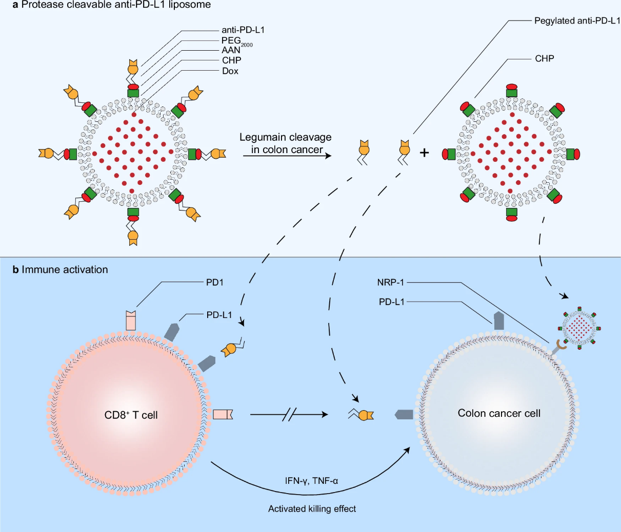 肿瘤免疫检查点阻断治疗是一种变革性治疗新策略。其中,细胞程序性死亡受体1(PD-1)和细胞程序性死亡配体1(PD-L1)免疫检查点阻断治疗(PD-1/PD-L1),在晚期癌症的临床治疗中取得了显著进展,部分患者获得了长期缓解且无临床复发。然而,只有小部分结肠癌患者对该策略有治疗响应。为此,该研究研发了一种蛋白酶可裂解PD-L1抗体脂质体(eLipo anti-PD-L1),用于增强结肠癌免疫检查点阻断治疗。在结肠癌环境中,该脂质体可被内源性天冬酰胺内肽酶裂解为两部分:聚乙二醇化PD-L1抗体部分和靶向性脂质体部分(可共递送阿霉素),同时发挥免疫检查点阻断治疗和靶向化疗作用。功能评估显示,该脂质体具有结肠癌靶向性、天冬酰胺内肽酶响应性、癌组织深部穿透性、免疫激活和免疫杀伤效应,在原位结肠癌荷瘤动物体内表现出显著的治疗效应。研究揭示,T细胞分化和T细胞受体信号通路相关基因参与了免疫激活效应;在结肠癌小鼠模型以及人结直肠癌组织样本中,PD-L1和天冬酰胺内肽酶均具有过度表达,提示蛋白酶可裂解PD-L1抗体脂质体具有良好应用前景。该研究对于发展肿瘤免疫治疗新的脂质体制剂策略奠定了理论和实验依据,具有重要的科学意义和潜在临床转化价值。