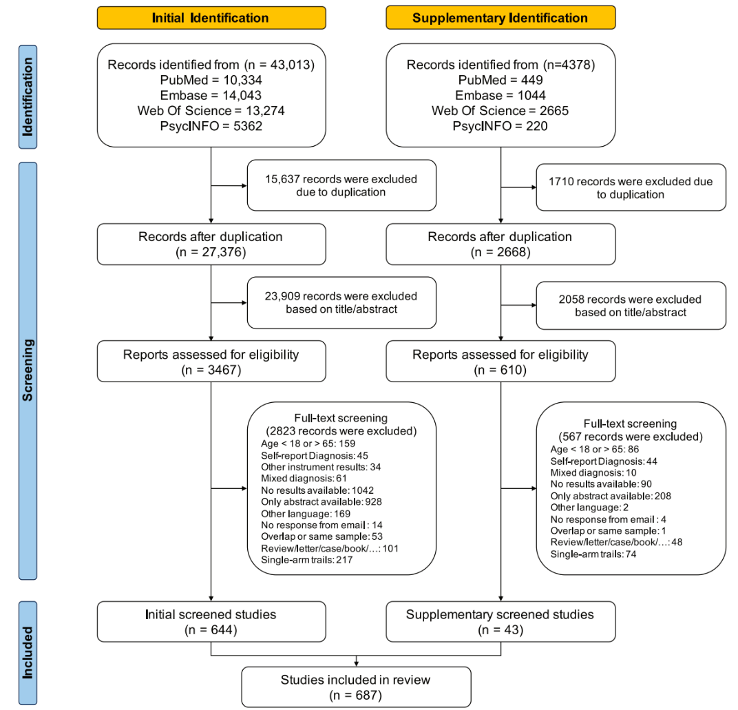 该研究在PubMed、Embase、PsycINFO和Web of Science数据库中进行系统检索,截至2024年3月20日,共检索文献47,391篇文献,最终纳入687项符合纳入标准的原始研究(图1)。研究团队对各类ERP成分(包括P300、MMN[失匹配负波]、P50、N1、N2、P1、P2等)进行了网络荟萃分析,以探究各类精神障碍患者与健康对照之间的系统性差异。