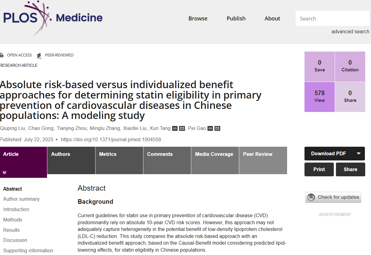 近日,北京大学临床医学高等研究院临床研究所/北京大学公共卫生学院高培研究员团队在《PLoS Medicine》杂志上发表了中国人群心血管病一级预防中他汀类药物推荐用药策略评价的建模研究成果,标题为《Absolute risk-based versus individualized benefit approaches for determining statin eligibility in primary prevention of cardiovascular diseases in Chinese populations: A modeling study》。该研究系统比较了目前临床指南推荐的传统基于绝对风险的策略与基于个体化获益的策略对于他汀类药物适用人群的推荐差异。