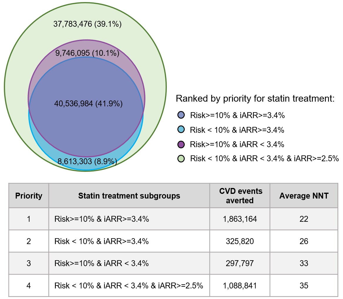 总体而言,基于个体化获益的策略能够更精准地识别哪些人最有可能从他汀治疗中受益,从而提升心血管病一级预防的干预效率。这一发现为心血管病一级预防实践提供了基于获益原则的个体化干预方案与决策工具,特别是在大量人群可能获益的中低收入地区以及具有不同危险因素特征的人群中,对于有效实施“以患者为中心”的医患共同决策尤其有价值。