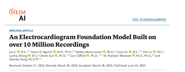 心电图(ECG)作为一种非侵入性诊断工具,在筛查和评估心脏疾病方面扮演着关键角色。近年来,人工智能技术的迅猛发展正在推动ECG分析进入智能化、自动化的新阶段。然而,现有AI-ECG模型往往局限于特定任务和小规模数据集,缺乏通用性和跨领域的泛化能力,难以满足临床中对多样化心电诊断的需求。近日,北京大学洪申达助理教授团队联合麻省总医院、哈佛大学和埃默里大学等机构,在《NEJM AI》上发表了题为“An Electrocardiogram Foundation Model Built on over 10 Million Recordings”的研究成果,提出了首个覆盖150种诊断类别、基于超过千万份真实心电图记录构建的通用AI基座模型——ECGFounder。该模型兼顾12导联与单导联ECG信号处理,支持从传统临床应用到可穿戴设备场景下的多任务扩展,标志着AI-ECG研究迈入以基座模型为核心的新阶段。