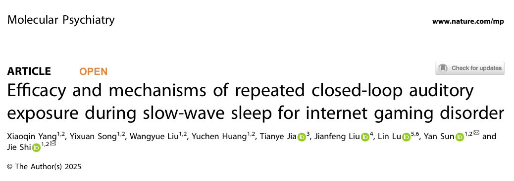 网络游戏障碍(Internet Gaming Disorder, IGD)是国家与社会广泛关注的重大公共卫生问题,但目前缺乏稳定有效的临床治疗手段。2025年5月27日,北京大学中国药物依赖性研究所时杰课题组在Molecular Psychiatry发表题为“Efficacy and mechanisms of repeated closed-loop auditory exposure during slow-wave sleep for internet gaming disorder”的研究成果。该研究首次将睡眠中的闭环声音线索暴露应用于网络游戏障碍患者的治疗,并揭示了睡眠中声音线索诱发的晚期纺锤波能量的增加是治疗起效的关键机制。该研究为睡眠状态下网络游戏障碍的精准干预提供了理论基础和新的作用靶点,也为未来相关精神疾病的治疗开创了全新的思路与方法。