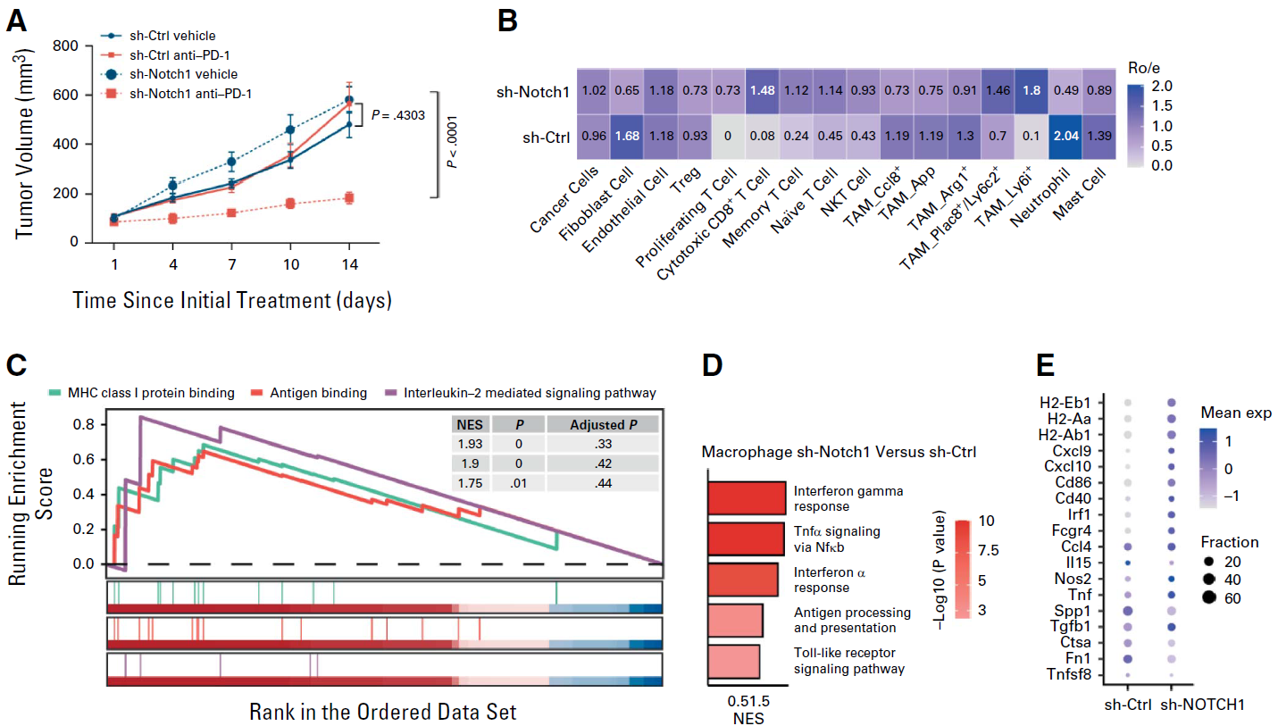 图2:Notch1敲低通过肿瘤微环境重编程提高小鼠ESCC肿瘤对抗PD-1疗法的敏感性。(A) 初始治疗后ESCC小鼠模型肿瘤体积随时间变化。(B) 来自野生型或Notch1敲低小鼠的ESCC皮下肿瘤中不同细胞群的比例。(C) 来自野生型或Notch1敲低肿瘤的CD8 T细胞中的富集通路分析。(D) 来自野生型或Notch1敲低肿瘤的巨噬细胞中的富集通路分析。(E) 来自野生型或Notch1敲低肿瘤的巨噬细胞中差异表达基因。