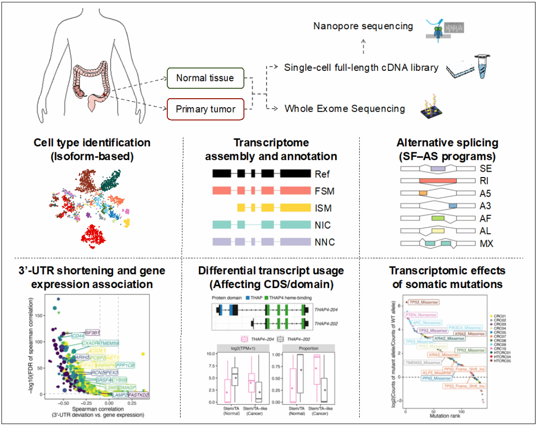 然而,当前针对结直肠癌的单细胞转录组研究多停留在以基因为单位的层面,缺乏对同一个基因产生的不同RNA异构体(isoform)表达特征、可变剪接调控模式及其导致的蛋白质氨基酸序列和功能改变的系统性研究。
