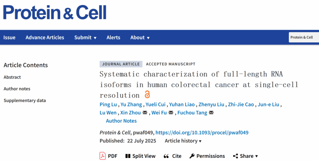 2025年7月22日,北京大学第三医院普通外科付卫/周鑫团队联合北京大学生物医学前沿创新中心汤富酬课题组,在Protein & Cell上发表题为Systematic characterization of full-length RNA isoforms in human colorectal cancer at single-cell resolution(单细胞分辨率系统解析人类结直肠癌全长RNA异构体特征)的研究论文。
