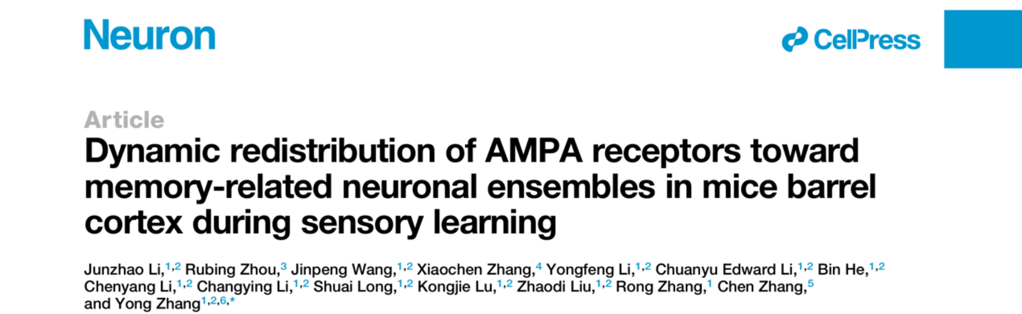 2025年7月9日,北京大学基础医学院神经生物学系、IDG麦戈文脑科学研究所张勇研究员课题组在《Neuron》在线发表题为“Dynamic redistribution of AMPA receptors toward memory-related neuronal ensembles in mice barrel cortex during sensory learning”的研究论文。本研究发现,感觉学习引起小鼠桶状皮层(barrelcortex)记忆相关神经元集群(印迹细胞,engramcell)突触可塑性变化,揭示AMPA受体在印迹细胞和非印迹细胞之间的动态重分布在感觉记忆形成和提取过程中发挥关键作用。
