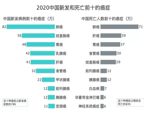 中国新发病例数前十的癌症分别为:肺癌、结直肠癌、胃癌、乳腺癌、肝癌、食管癌、甲状腺癌、前列腺癌、胰腺癌及宫颈癌。而死亡人数排在前十的肿瘤分别为:肺癌、肝癌、胃癌、食管癌、结直肠癌、前列腺癌、胰腺癌、白血病、非霍奇金淋巴瘤、神经系统癌症。其中,北京市男性居民的发病率排在前三位恶性肿瘤为肺癌、结直肠胃癌,女性为乳腺癌、肺癌、甲状腺癌,死亡的主要原因是肺癌和消化道肿瘤。