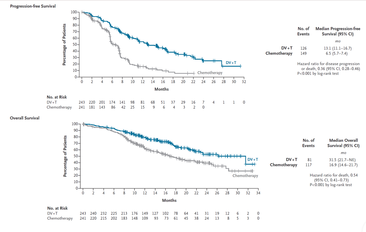 图3.RC48-016研究主要研究终点:联合治疗组较化疗对照组的无进展生存期(Progression-Free Survival,上图)与总生存期(Overall Survival,下图)双终点达到显著差异