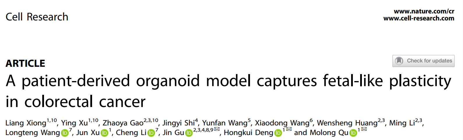 2025年7月4日,北京大学邓宏魁/屈默龙课题组联合北京大学首钢医院顾晋教授团队合作在Cell Research在线发表题为A Patient-Derived Organoid Model Captures Fetal-Like Plasticity in Colorectal Cancer 的研究论文。该研究开发出一种化学诱导的结直肠癌病人来源的新型类器官体系(CiPDOs),首次在体外长期稳定捕获具备肿瘤“胎儿样状态”(Oncofetal State, OnFS)的肿瘤细胞,并揭示其在结直肠癌进展、转移和化疗耐药中的关键作用。