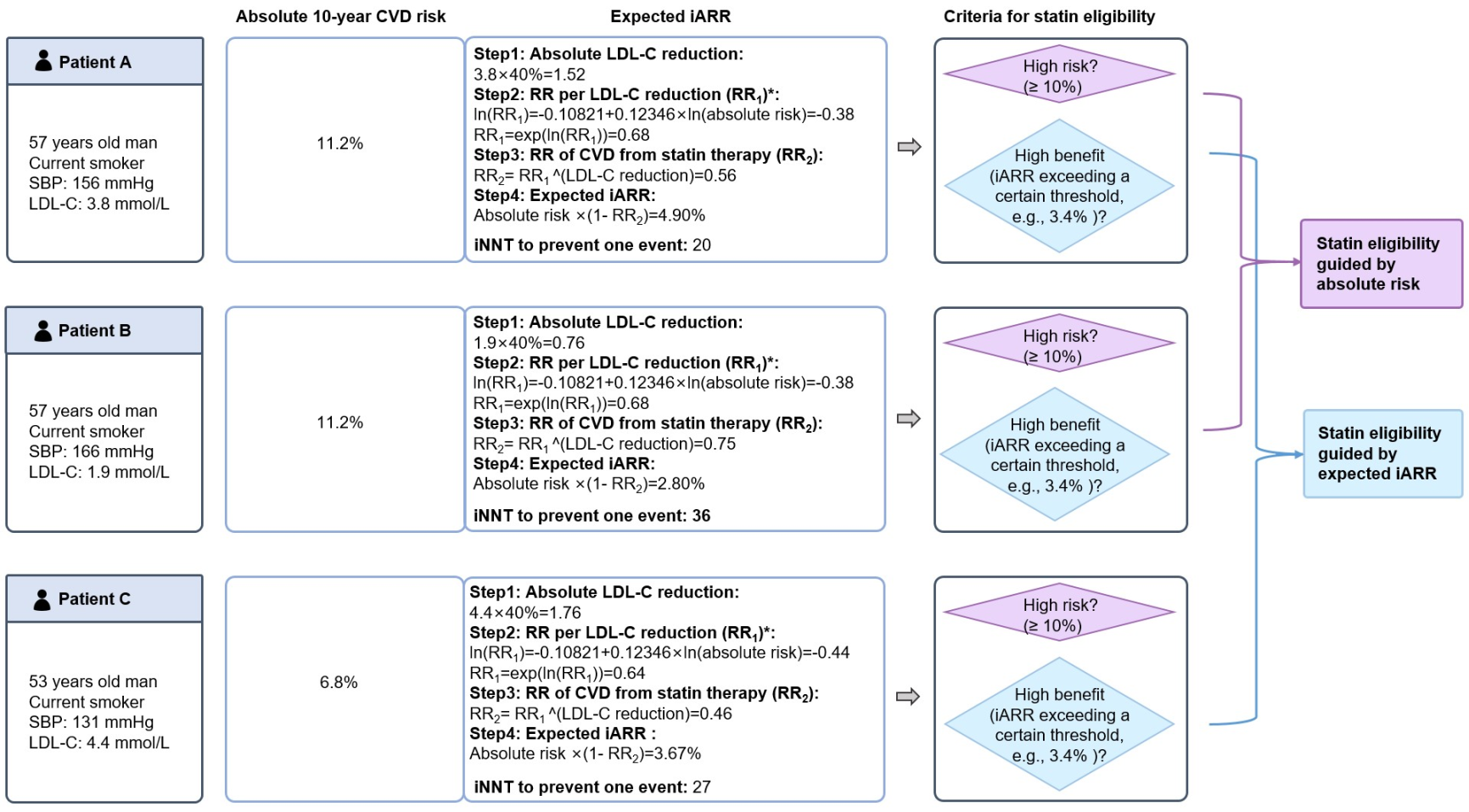 在临床实践中,即使相同风险的个体,实际能从治疗中获得的获益也可能存在明显差异。例如,按照传统临床指南推荐的绝对风险阈值,下图中个体A和B都会被推荐使用他汀(风险高于10%),而个体C未被推荐(风险低于10%)。然而,若采用个体化获益方法,结果却完全不同:个体A(iARR 4.90%)和C(iARR 3.67%,高于阈值)被推荐用药,而个体B(iARR 2.80%,低于阈值)则不再适用。因此,个体化获益方法能够更好地根据治疗带来的潜在获益推荐个体化干预策略,而不仅仅依赖绝对风险水平。