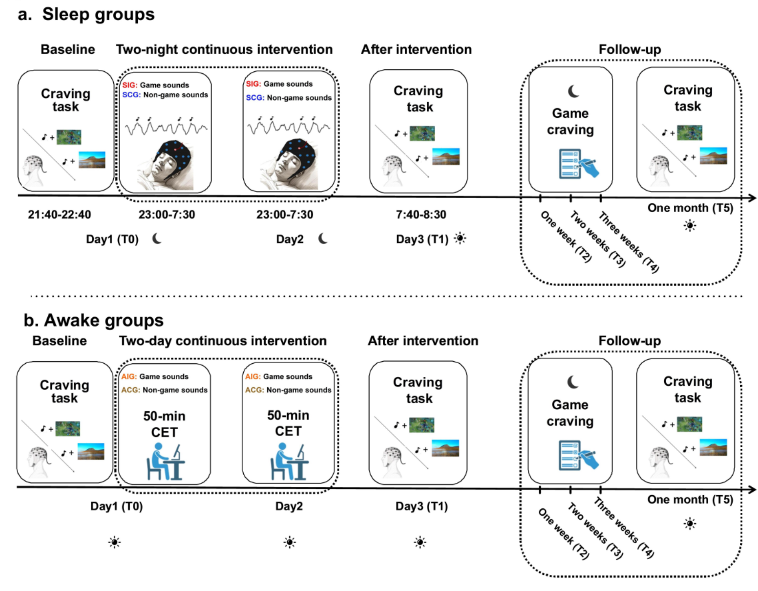 该研究旨在探讨慢波睡眠状态下的闭环线索暴露对IGD的疗效及其机制,并与清醒条件下的线索暴露疗效相比较。研究共招募了84名网络游戏障碍患者,将其随机分为睡眠干预组、睡眠对照组、清醒干预组和清醒对照组。其中,睡眠干预组采用闭环调控技术连续两晚在慢波睡眠时期的慢振荡的上升阶段给予约300次的游戏相关声音,睡眠对照组则采用相同的方法给予相应次数的游戏无关声音,而清醒干预组和清醒对照组连续两天在清醒状态下分别暴露游戏相关或无关声音。四组均在基线和干预后评估游戏渴求程度和游戏时间,并在干预后1周、2周、3周以及一个月进行随访。同时,在基线、干预后及一个月后采集线索诱导任务下的脑电信号特征(P300振幅)。