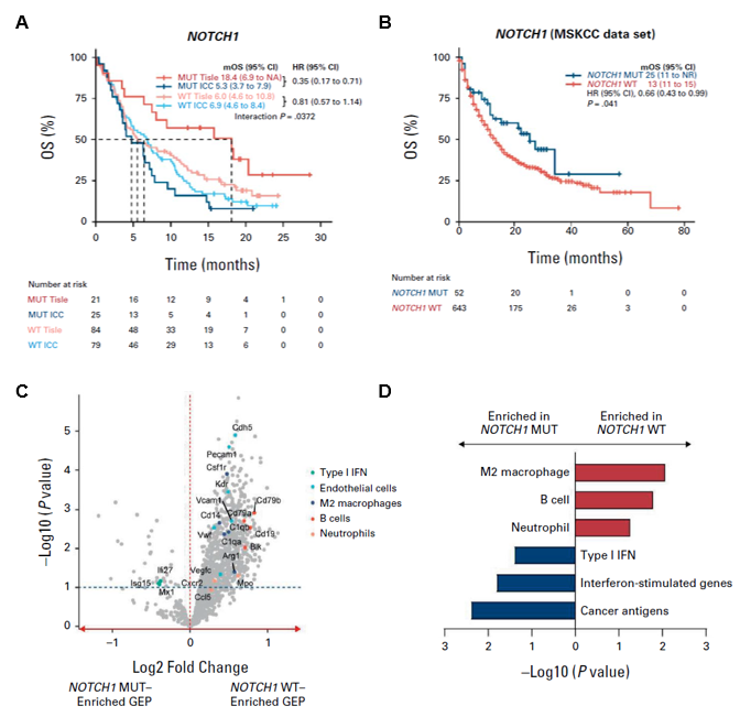 通过对RATIONALE-302试验中NOTCH1野生型与突变患者的肿瘤的差异表达基因分析发现:野生型肿瘤中,与B细胞、中性粒细胞、M2型巨噬细胞及内皮细胞相关的基因表达显著上调,而突变肿瘤则呈现出I型干扰素相关基因表达的升高。这种I型干扰素富集以及较低的免疫抑制状态,可能正是NOTCH1突变预示替雷利珠单抗疗效更佳的分子机制。